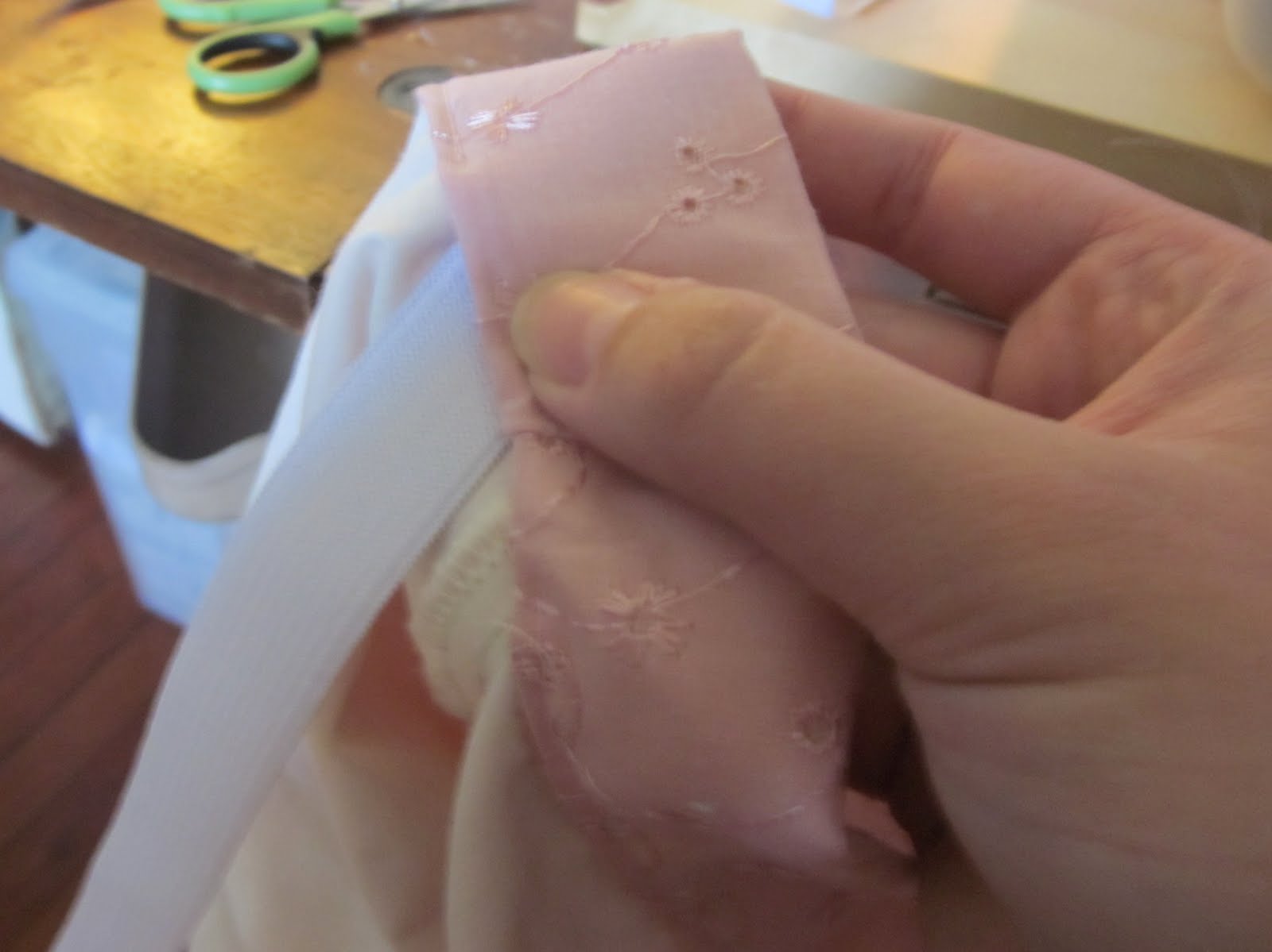 Fold and press the top edge under about a quarter of an inch, than an inch or so to make the casing. Sew close to the bottom edge leaving an opening for the elastic.